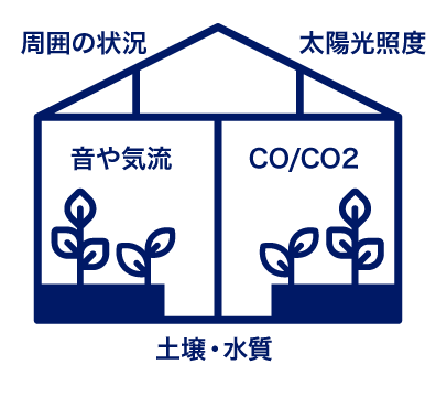 例)大気中の物質/振動/建物などの歪み/圧力/温度/気温/湿度/加速度/音響/土壌/電圧/電流 …その他